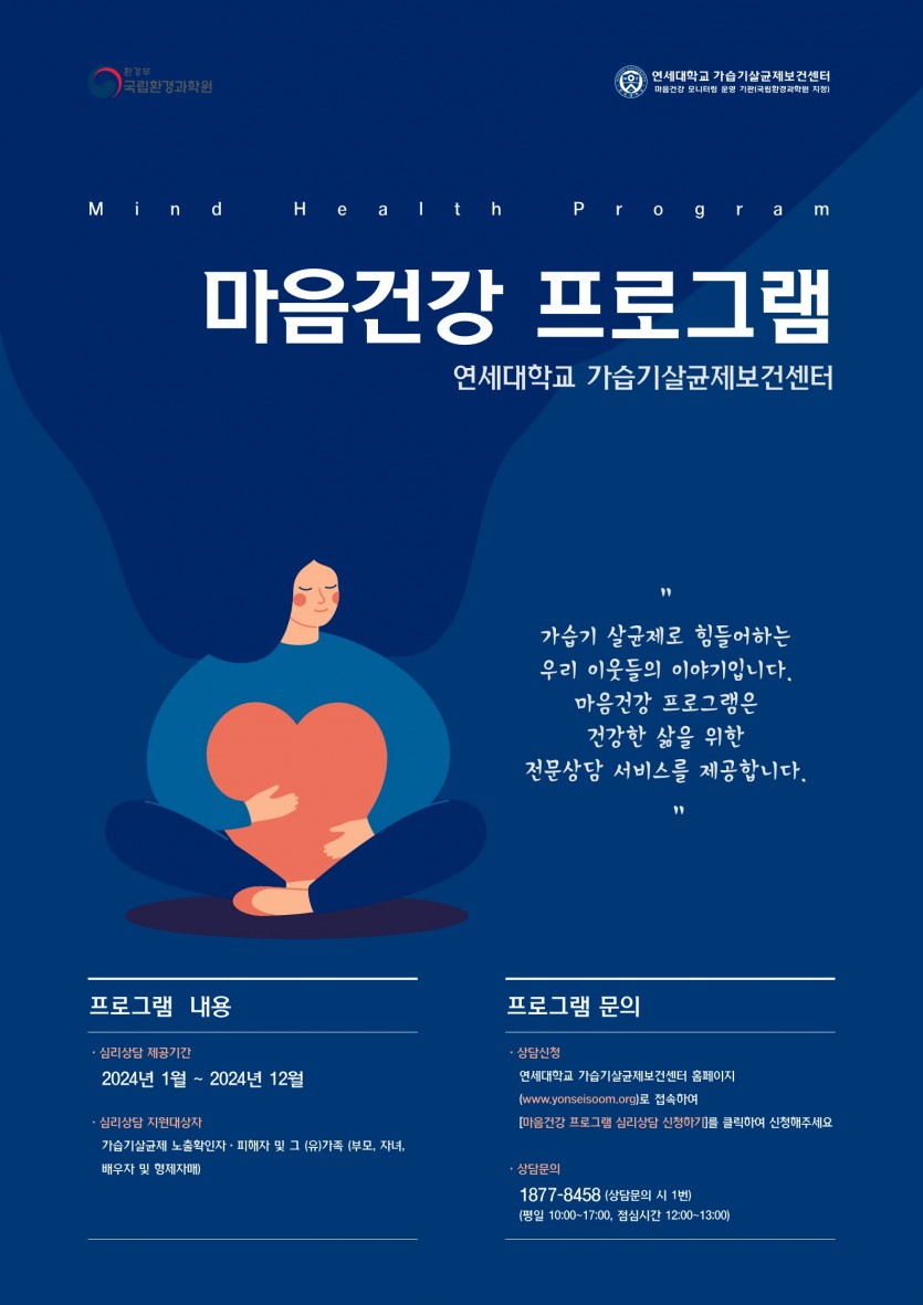 본 사업은 국립환경과학원이 발주하고 연세대학교에서 수행하는 "가습기살균제 보건센터 건강모니터링 운영(연세대학교) 사업"이며, 가습기 살균제 피해자들의 심리적 안정과 삶으로의 복귀를 위한 상담을 제공하는 국가사업입니다.